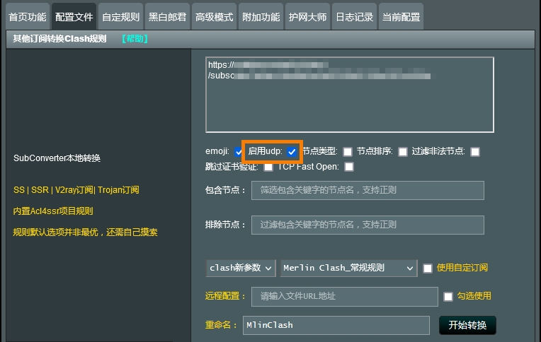 使用SunConverter本地转换/ACL4SSR在线订阅,勾选启用UDP,订阅一个新的支持UDP的配置文件‘。