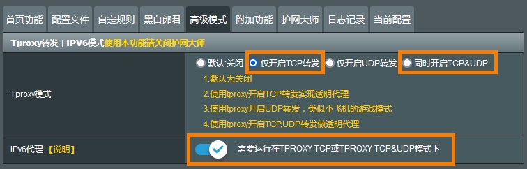 在【高级模式】选项卡,【Tproxy转发|IPV6模式】模块里,开启TProxy转发(仅开启TCP转发或者同时开启TCP&UDP);