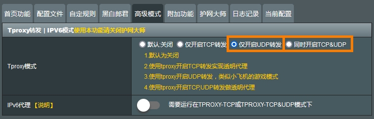 在【高级模式】选项卡,【Tproxy转发|IPV6模式】模块里,开启TProxy转发(仅开启UDP转发或者同时开启TCP&UDP)